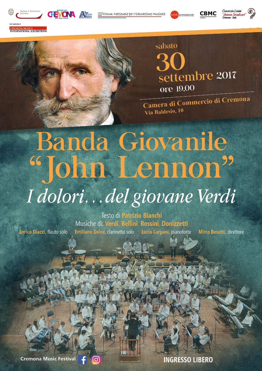 Il secondo: un Concerto dal titolo "I dolori del giovane Verdi", dalle ore 19,00 sempre di Sabato 30 Settembre presso l'Auditorium della Camera di Commercio (via Baldesio 10, adiacente piazza Duomo), a dimostrazione del lavoro che viene svolto dalle Associazioni Musicali, tra le quali le Bande Musicali.