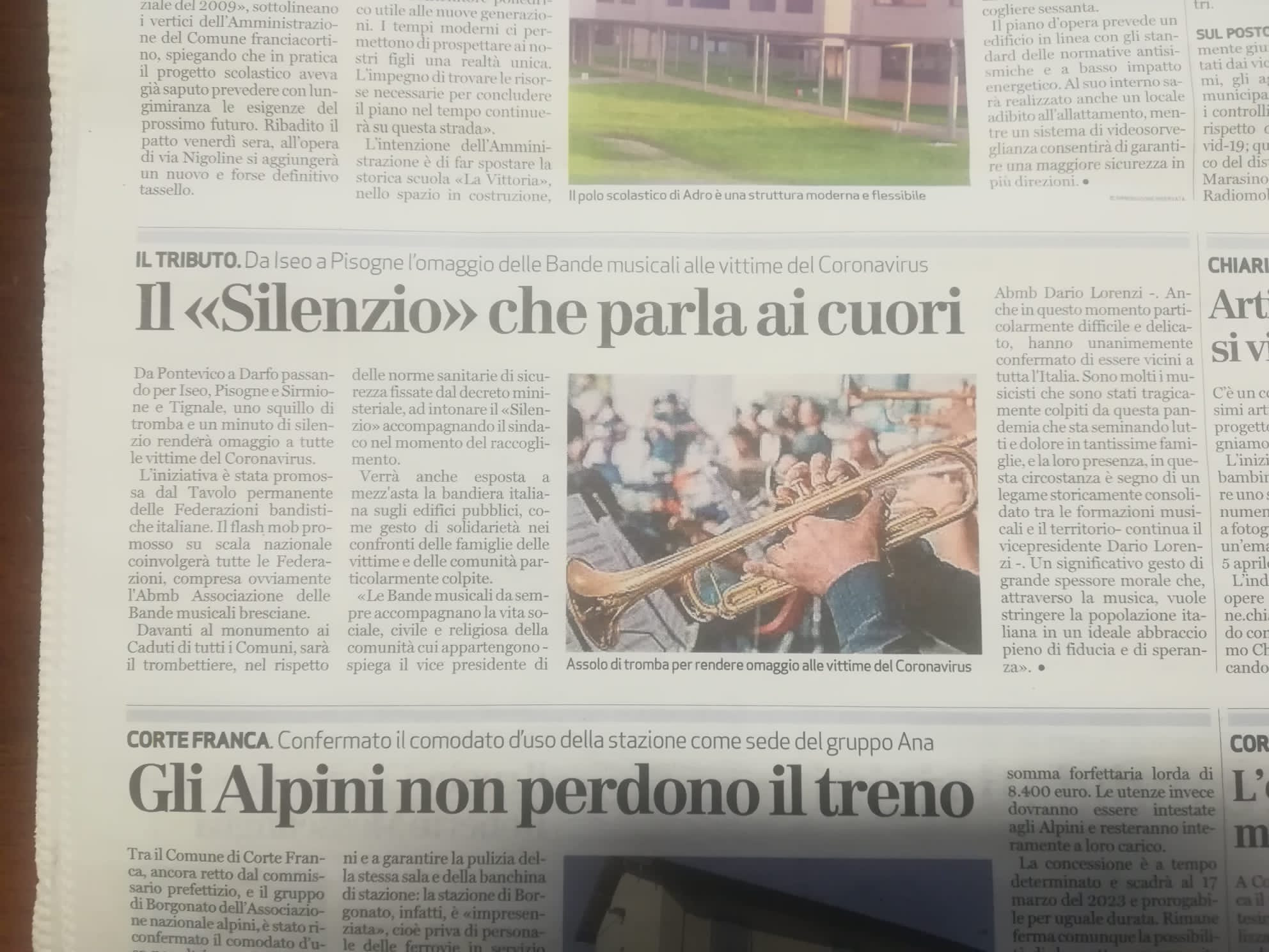 Il "Tavolo Permanente delle Federazioni Bandistiche Italiane", le Federazioni aderenti e le relative Bande Musicali associate, aderiscono convinti all'iniziativa del 31 Marzo 2020 promossa dall'ANCI, su proposta della Provincia di Bergamo. Martedì prossimo, con questo gesto, onoreremo tutte le vittime del "Coronavirus", manifestando la nostra solidarietà ai loro famigliari.