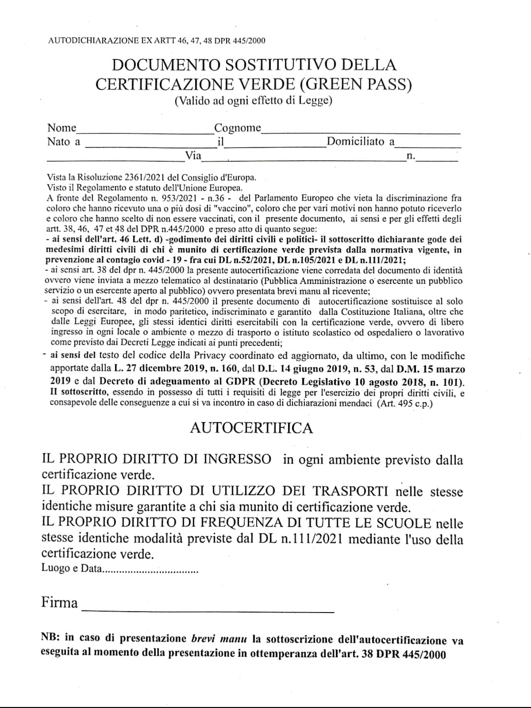 LE AUTODICHIARAZIONI SOSTITUTIVE DEL "GREEN PASS" SONO UNA BUFALA